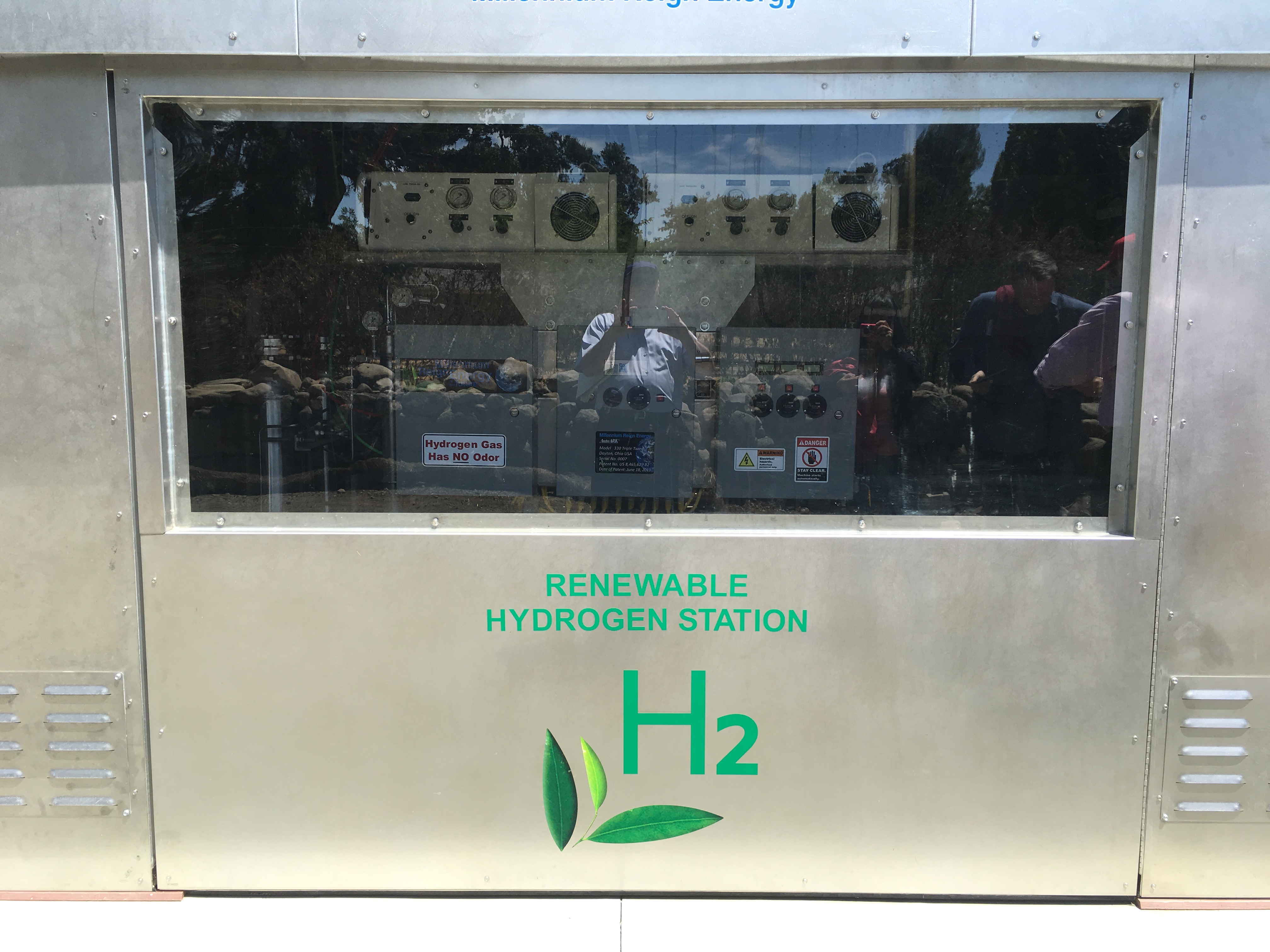 One node of particular interest produces hydrogen gas through the process of electrolysis, which separates the hydrogen and oxygen in water. The electricity required to affect this separation is supplied by solar panels, and the hydrogen gas produced is compressed and then used for stand-alone energy-producing hydrogen fuel cells and for hydrogen fuel cell vehicles which operate emissions-free.