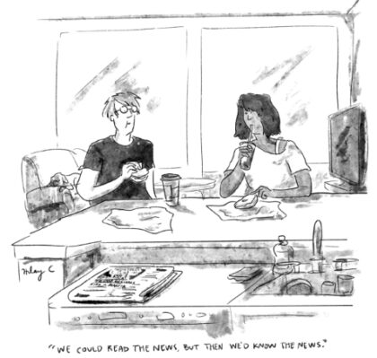 Cartoon by Hilary: “We could read the news, but then we’d know the news.” Cartoon by Hilary: “We could read the news, but then we’d know the news.” December 24th, 2025