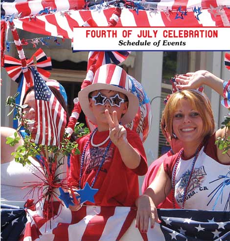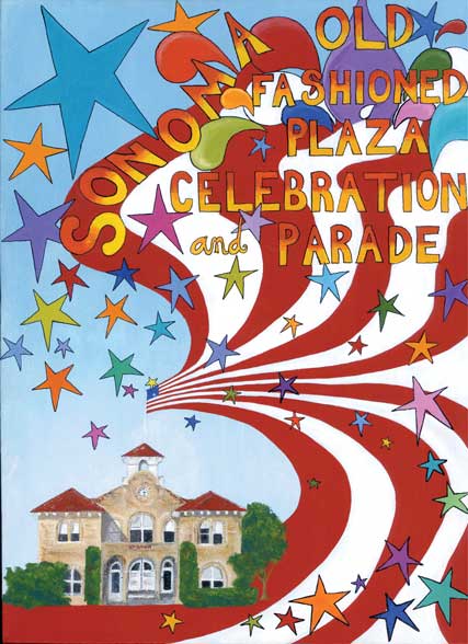 The 2008 Fourth of July poster was created and designed by Elizabeth Tashman, well-known in the community as the Sonoma Charter School art instructor and the teen art coordinator for the Sonoma Community Center. Her “July 4th Celebration!” poster was painted with acrylics on canvas and created specifically for the event.