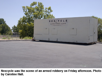 On July 18 at about 3:57 PM, Sonoma Police Deputies received a call for an armed robbery at the recycling center behind the Safeway store on W. Napa St. The victims reported a white male and a Hispanic male armed with handguns had demanded money. They said the suspects also mentioned having a machine gun. The suspects took cash from the victims and then fled northbound on 5th St. West in a black sports car. The victims could not see the license number as the rear plate rear was bent upward to avoid detection.