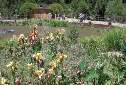 At Benziger Family Winery, Mimi Gatens, Director of Sustainability, talked about basic principles of “biodynamic farming,” a method based on the ideas of German philosopher Rudolf Steiner. “Everything we use to nourish the farm comes from the farm,” she said. For example, they bury a cow horn full of the winery’s own manure to produce soil that, they say, makes grape vines thrive. Also, they time their planting and pruning according to phases of the moon, in acknowledgement of its gravitational pull, so that newly planted roots, for instance, would be drawn into the earth and not pulled toward the surface. Even the compost pile is designed according to principles set up by Steiner, with herbs such as chamomile mixed in for balance. As the group relaxed in the patio shade nibbling on brown-bag lunches, Micheli lectured on the dynamics of the recycling ponds. Then, accompanied by the sounds of hens and sheep, lambs and frogs, they toured the series of recycling ponds that treat all the water that irrigates the vines.