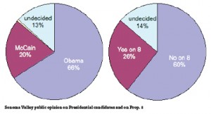 Of the six questions asked, the responses on two of them were remarkably similar: Presidential preference and reported Prop. 8 (marriage definition) voting. As shown on the accompanying charts, voter opinions on these two questions were in rough proportion to major party affiliation, which in Sonoma Valley has the following distribution: