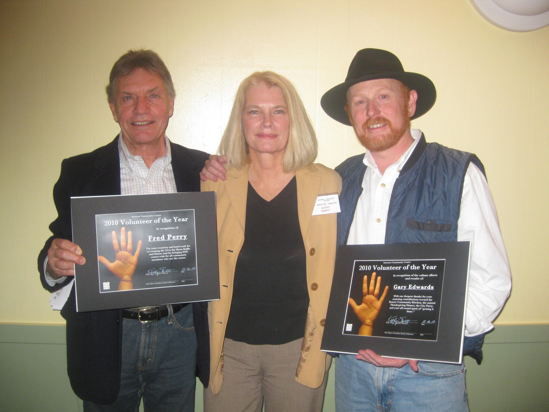 At the Sonoma Community Center open house on Tuesday night, Kathy Swett, the center’s executive director, congratulated Fred Perry and Gary Edwards as Volunteers of the Year.