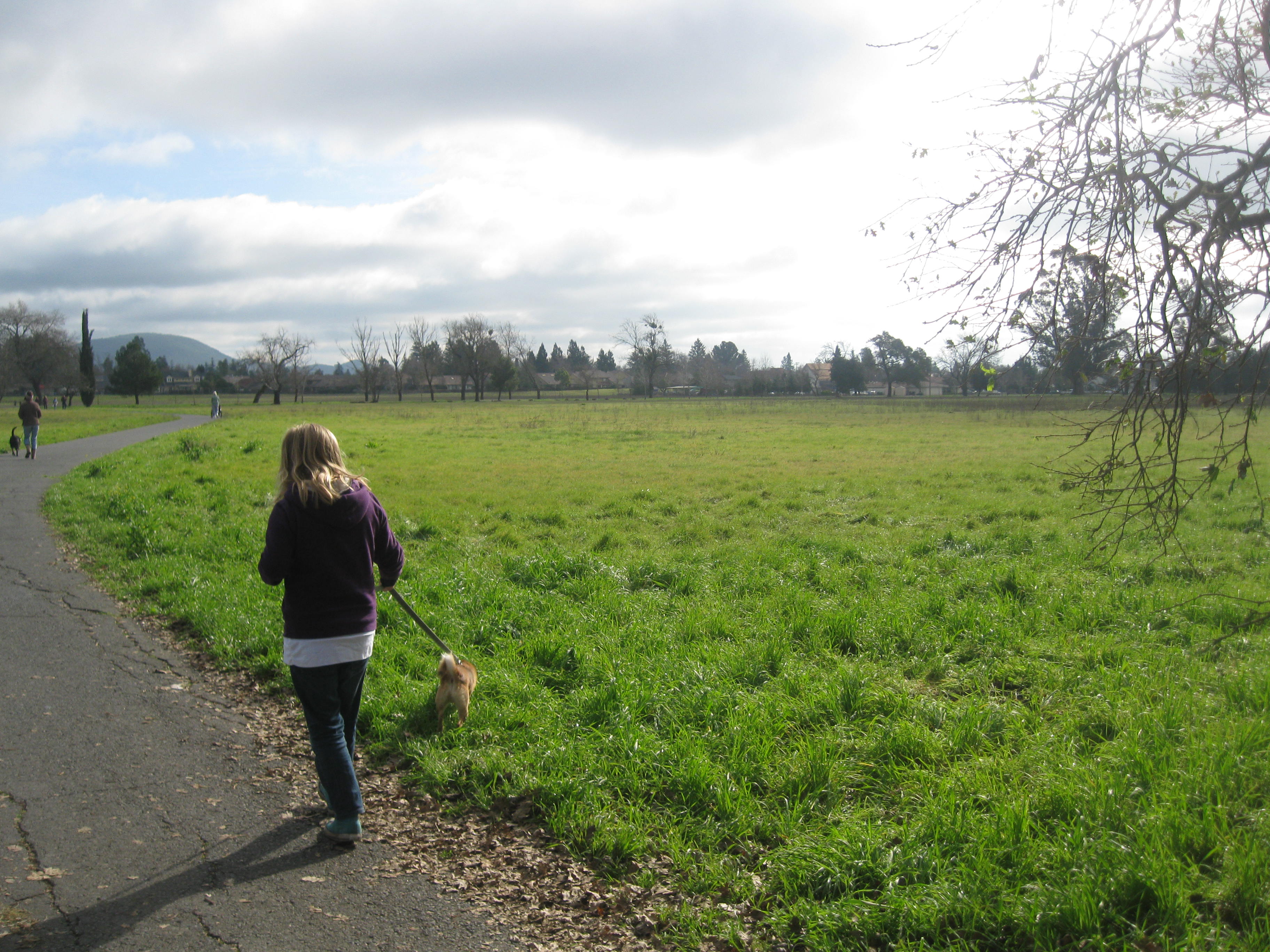 Dogs walked their people along the bike path near Vallejo House as the sun came out Sunday morning. Similar weather is expected, chilly nights included, until rain clouds move back in on Tuesday.