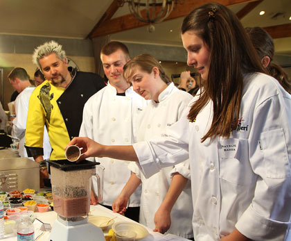 But to the students, none of this really mattered as they readied ingredients, and later took their places at row upon row of cooking stations as the video production got under way. Fieri’s jovial personality soon infected the room as he commanded the crowd shouting questions like, “Are you ready to have some fun?” He passed around a microphone so students could tell him why they were interested in cooking. The answers ran the gamut, but generally kids said they liked to eat, wanted to learn how to cook good food and have fun doing it. All good enough for Guy.