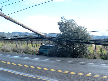 A power poll versus car entanglement on Arnold Drive on Friday morning resulted in a losing situation for everyone involved. The driver escaped injury but the resulting accident knocked out power to almost 9,000 Sonoma Valley residents. As of 9 a.m., PG&E crews had restored power to selected spots throughout the Valley and were working fast to get everyone else back online.