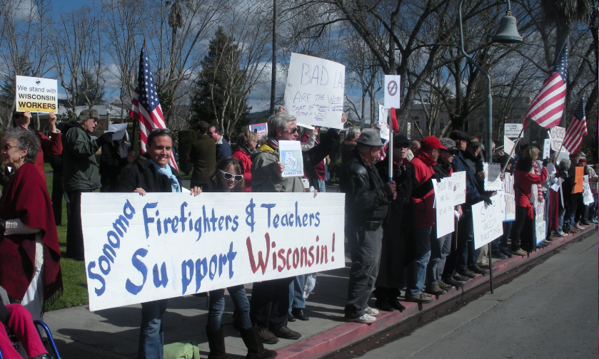 A smiling Yannick Phillips stands amid a crowd of protestors positioned at the top of Broadway on Saturday. The Sonoma rally, in solidarity with teachers, nurses, firefighters, students, police officers and others protesting in Wisconsin, is part of a national effort calling itself “Save the American Dream,” and organized by the Sonoma Valley Democratic Club to protest potential cuts to NPR, the EPA, food aid to hungry kids, clean energy research, Americorps and more. For more information, contact Ben Boyce at 478.9663.