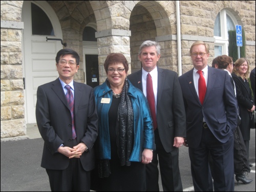 The city hall gathering was held to honor the official recognition of sister-city status with Penglai, China. After a walking tour of the Plaza led by City Historian George McKale, the group lunched at the Swiss Hotel.