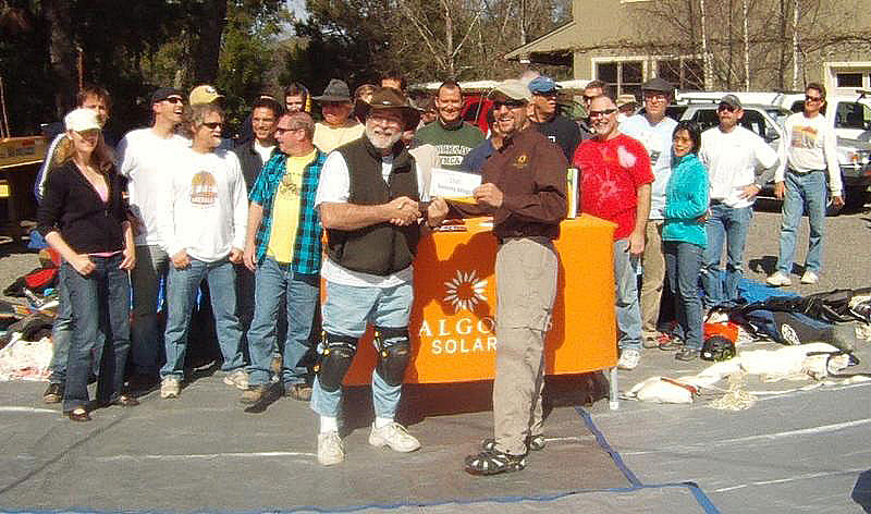 Sonoma Wings, the Redwood Empire’s local hang gliding and paragliding club recently received $500 from Real Goods Solar consultant Anthony Abaté. Club treasurer Ernie Camacho is the owner of a new 4.7kW PV System and received the check from Abaté at the annual parachute repack clinic hosted by Justin Miller and Garden Creek Ranch where more than thirty reserve parachutes were inspected and packed on a recent Saturday.