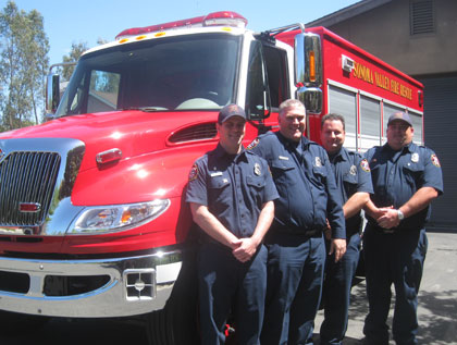 Firefighters Kyle Lely, Sean Lacy, Trevor Smith and Bill Harper show off the newest rescue vehicle in the Sonoma Valley Fire & Rescue Authority (SVFRA) fleet. The 2011 260 horsepower diesel rig, along with its trained crew, will respond to emergencies in which people are trapped or buried by structures, debris or earth. It can also perform swift water rescues and be used to stabilize buildings, among other rescue scenarios. The “Type 2 Rescue” unit will be stationed at Station #3 on Aqua Caliente Road and available for use throughout Sonoma County when it comes on line on June 1. Smith said being chosen by the county as the host site for the vehicle was a big honor for the SVFRA.