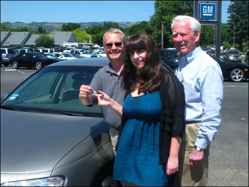 Elena Tennant takes the keys to her new car from Sonoma Chevrolet’s Dan Roseland, left, who donated the Cadillac to the Sonoma High School grad night raffle. Bob Nobles, at right, started the tradition many years ago when he owned the dealership.