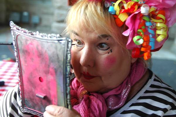 Popo The Clown (a.k.a. Penny Byrd) touches up her makeup at the final Tuesday Night Farmers Market of the year. The season was the first first managed by The Valley of the Moon Certified Farmer’s Market. Bill Dardon, the group’s president, said the season was a big success — logistically, financially and for the lack any controversy. The weekly event will return to the Plaza in May of 2012.