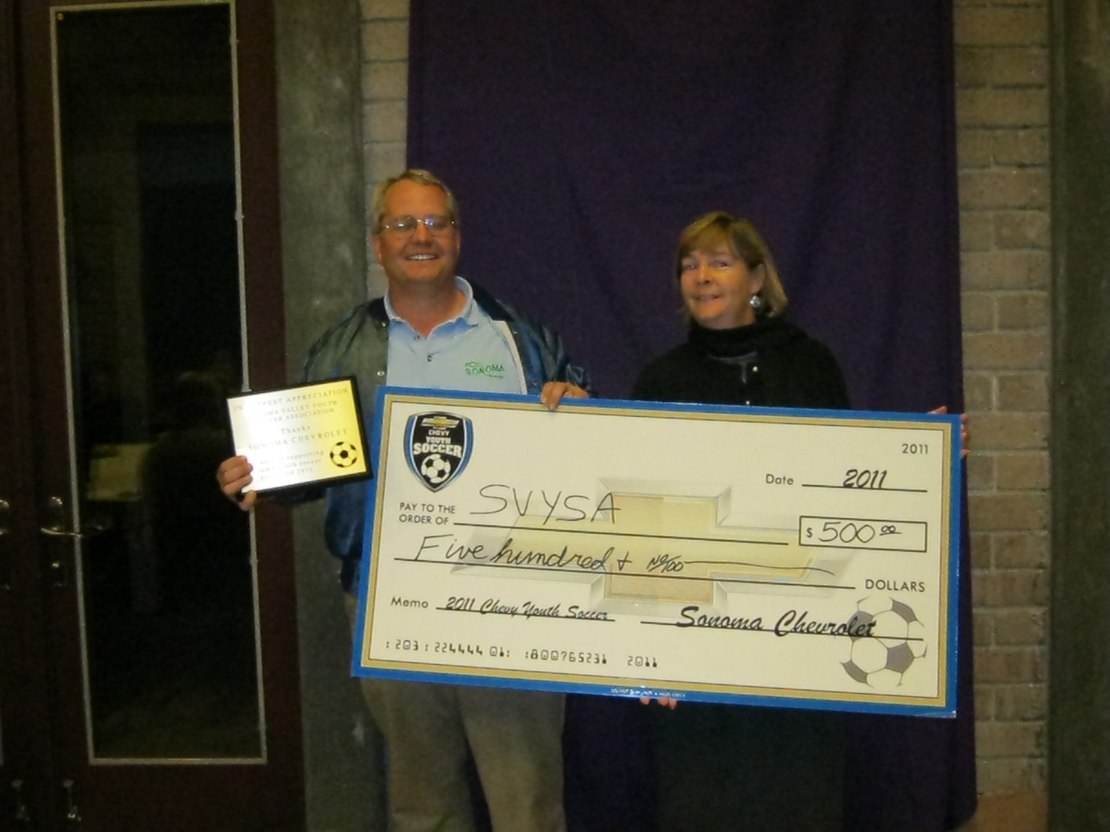 Dan Roseland of Sonoma Chevrolet, presents Sonoma Valley Youth Soccer Association President Colleen Paul, with a check for $500.
