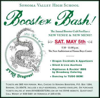 With a new menu and new venue, the Sonoma Valley High School Booster Club’s annual Booster Bash is firmly set for Saturday, May 5, at Hanna Boys Center. Cocktails and appetizers, a barbeque tri-tip dinner and dancing to the band Tudo Bem are all part of the evening from 5:30 to 11 p.m.
