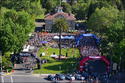 Seen from the escort helicopter hovering over Broadway, nearly 2,000 bicyclists mass for the start of the Echelon Sonoma Gran Fondo, the fundraising bike race that made its Sonoma debut on May 12. The rides of 11, 50 and 75 miles were followed by a food and music festival on the Plaza. “It was an off-the-charts success,” said event producer Hunter Zeising. “We love the town and want to come back. This could really become a signature event.”