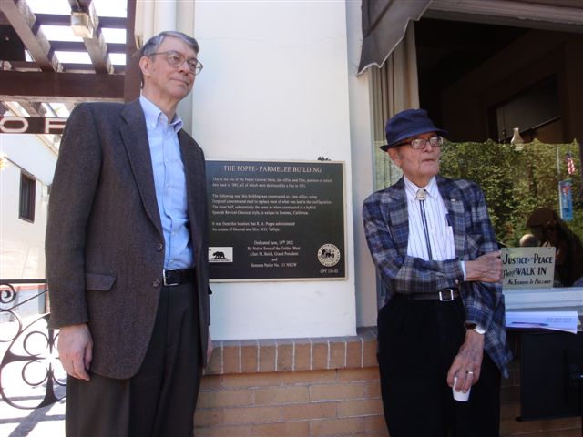 The Sonoma Square site once occupied by a general store and the offices of General Vallejo’s lawyer, the Poppe-Parmelee Building, receives a plaque commemorating the 100th anniversary of its construction.