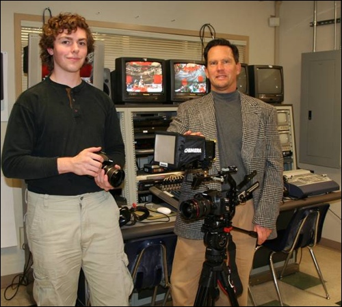 Two complete camera packages including high def digital cameras, lighting kits, extra batteries media cards and readers. The Video Production Program at SVHS produces movies, videos and a weekly newscast for the entire school. Photo: Hansen, at right, with student Kerrick Martin.