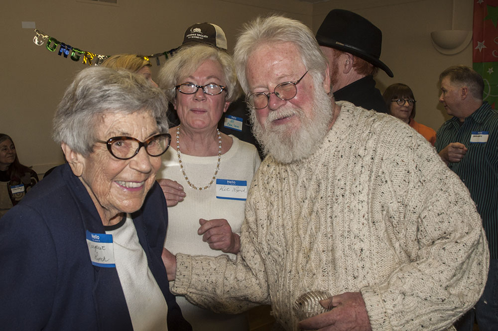 Sonoma mailman Joe Kennedy, retiring after 40 years, receives a special delivery of best wishes from Margaret and Kit Lynch, two of some 200 residents at a farewell celebration on Jan. 27. “With his twinkling eyes, bushy white beard (which was brown in the 1980s!), he was a familiar, beloved and interesting presence on our streets, and will be missed,” said Linda Alwitt.