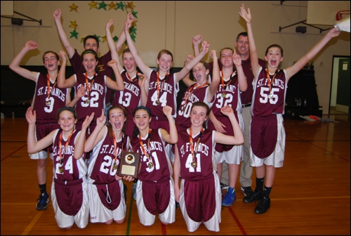 The St. Francis of Sonoma 8th grade girls team celebrates Sunday after winning the North Bay CYO Division 2 Championship with a 28-27 victory over St. Vincent’s of Petaluma.