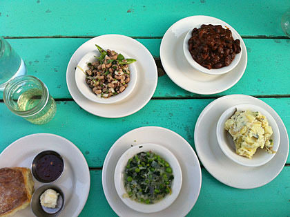 Fluorescent spring peas bob in a minty broth of butter and green onion, bubbling macaroni and cheese is, thank the heavens, not at all fancy. Sticky beans are baked, utterly delicious, rich with smoked pork and molasses maybe. A little bowlful of black eyed peas, spotted with white onion, is comfort food at its finest. Dinner here passes in a fog of honey, in which the southern gal in me must dip the chicken, and the biscuit. I cannot stop, but must. Maybe just one more sliver of homemade dill pickle.