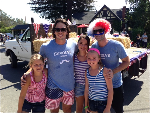 The famously single Ben Flajnik and his business partner Danny Fey, repping their Envolve Winery in Sonoma’s Fourth of July Parade, pose with fans Abbigail Smith, Norah Coleman and Dylann Thibodeau.