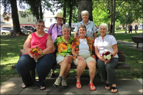 Sharon Church and Vicki Baseheart, seated center, were finally able to marry in the Sonoma Plaza Friday afternoon, next to the bench where they first met 21 years ago.