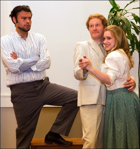 Pablo Picasso (Nestor Campos, Jr.) and Albert Einstein (Rusty Thompson) vie for the attentions of Suzanne (Hannah Pryfogle) in “Picasso at the Lapin Agile,” opening August 8 on the Rotary Stage of the Sonoma Community Center. Playwright Steve Martin — yes, that Steve Martin – brings together the two geniuses, young and as yet undiscovered, in a bar in 1904 Paris.