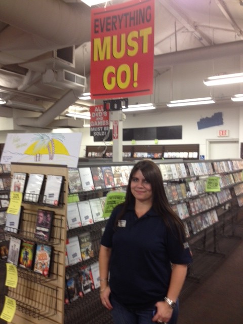 Blockbuster Manager Janey Eslick, who has worked at the store since it opened 14 years ago, stands among the remaining items as the store readies to close on November 10. And when she says everything must go, she means it – from CDs marked down to 99-cents to store fixtures, the fax machine and the vacuum cleaner. (The candy is long gone.)