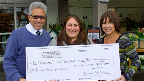 Liz Bauer of Adele Harrison Middle School, center, accepts a $2,203 donation from Sonoma Market, represented by Al Marino and Erin Downing. The funds, proceeds from the store’s See’s candy drive, will allow students take an upcoming trip — an outdoor education trip to Occidental, in May — who otherwise could not afford to attend.