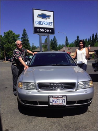 Teenager Christine Alverez takes the keys to her new car from Sonoma Chevrolet’s Dan Roseland, his annual donation to the Sonoma High School grad night raffle. In a tradition begun by Bob Nobles, the dealership gets a used car in top shape – this year, a 2001 Audi — and then makes it the grand raffle prize at the school’s safe and sober graduation night party.