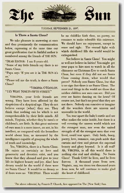 DEAR EDITOR: I am 8 years old. Some of my little friends say there is no Santa Claus. Papa says, 'If you see it in THE SUN it's so.’Please tell me the truth; is there a Santa Claus? VIRGINIA O'HANLON 115 WEST NINETY-FIFTH STREET