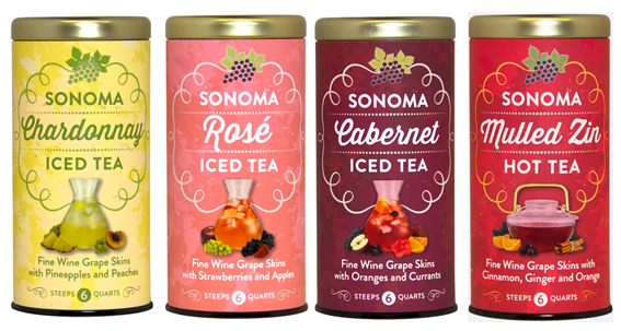 Flavors include Sonoma Chardonnay (“reminiscent of a vacation in a glass”), Sonoma Rosé iced tea (“a sophisticated sipper”), Sonoma Cabernet (“skip the wine goblet and pour it into a big, tall glass”) and Mulled Zin Hot Tea (“soothing and fragrant”). All teas use their respective wine grape skins for flavor, with the rosé blending Pinot Noir and Sauv Blanc.