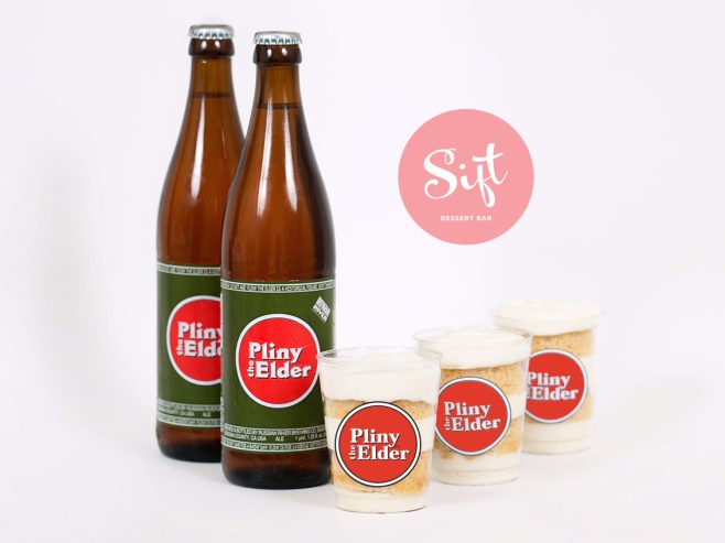 Co-created by Russian River Brewing Company and Santa Rosa based Sift Dessert Bar, the dessert comprises five pieces of brown sugar cake soaked in Pliny the Elder beer layered between Pliny flavored mousse and a spiced orange glaze.