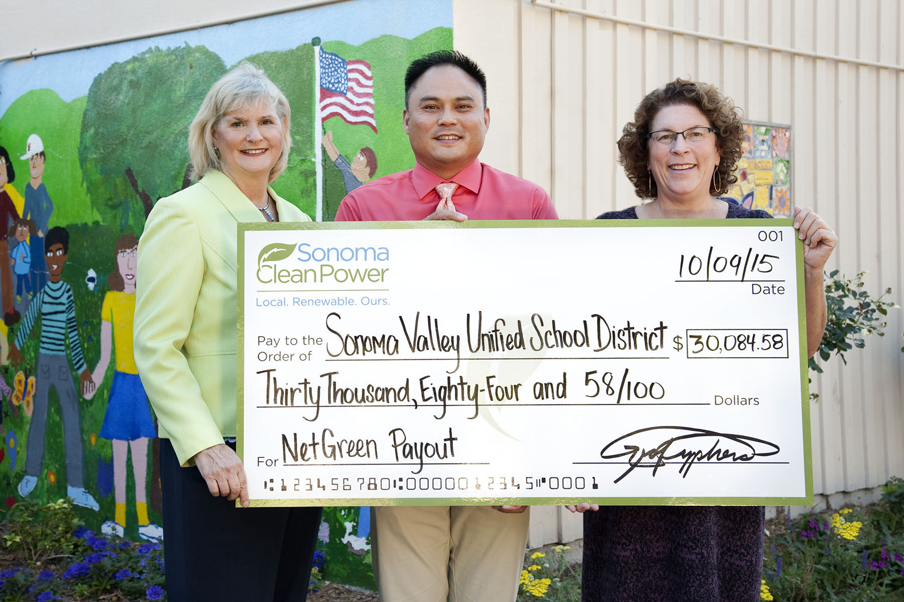 School District Superintendent Louann Carlomagno, at right, accepts a $30,000 check from Sonoma Clean Power, represented by board member Susan Gorin and CFO John Bartolome, at Prestwood Elementary School.