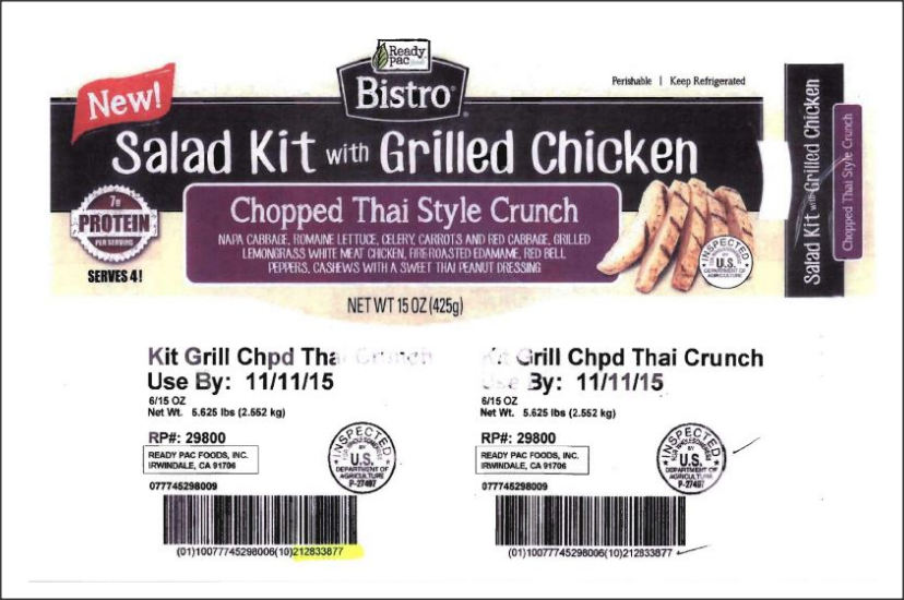 A recall has been issued for Ready Pac Foods Bistro Salad Kit with Grilled Chicken, Chopped Thai Style Crunch.
