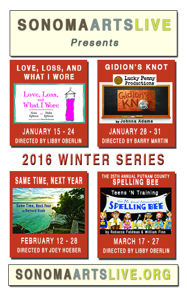 The first of show of 2016 will be “Love, Loss and What I Wore,” which debuts on January 15. Written by Nora Ephron and Delia Ephron, and directed by Sonoma Arts Live Education Director Libby Oberlin, MA, it uses clothing, accessories and the memories they trigger to tell funny and often poignant stories. A talented cast of seasoned Sonoma actresses – Jill Wagoner, Julia Holsworth, Sheila Lichirie, Cat Smith and Rhonda Guaraglia – will bring these relatable stories to life to create an enduring, memorable theatre experience. The show will run Thursdays through Saturdays at 7:30 p.m.,, with Sunday matinees at 2 p.m. Jan. 15-24.