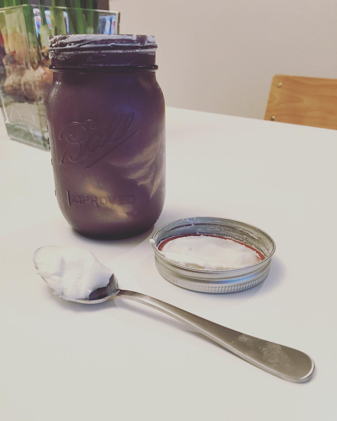 You’ll know it’s ready when the cream moves more slowly (makes less noise) and the cream coats the side of the jar. Once it gets at this point, take it easy on the shaking. Check your whipped cream.