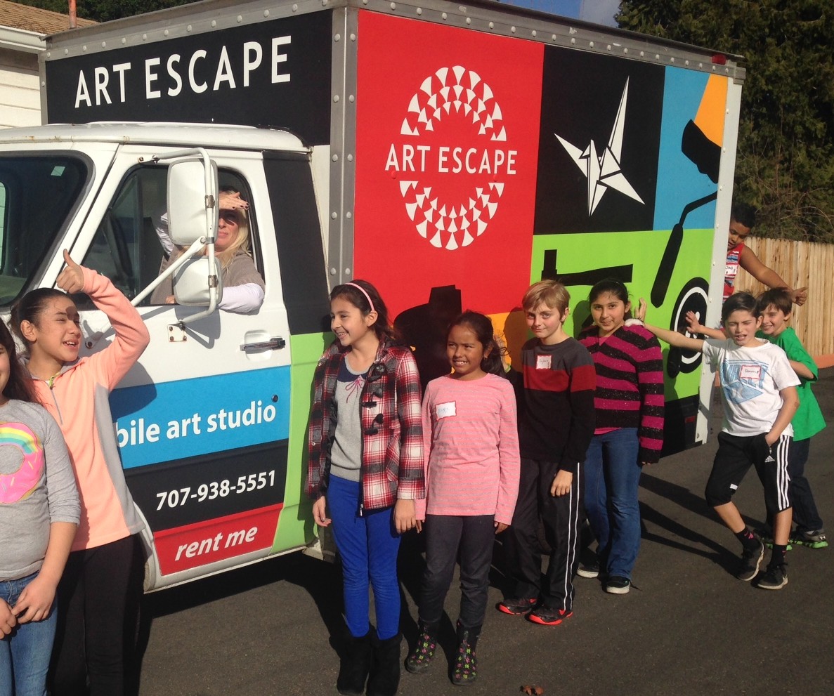 With a donated truck and funds from Walsh Vineyards Management, and exciting exterior graphics created and donated by local artist Ken Winston, Art Escape has rolled out its unique concept, winning praise from both kids and adults. A grant from Impact100 Sonoma has enabled the studio to bring art lessons to K-5 students at four public schools.