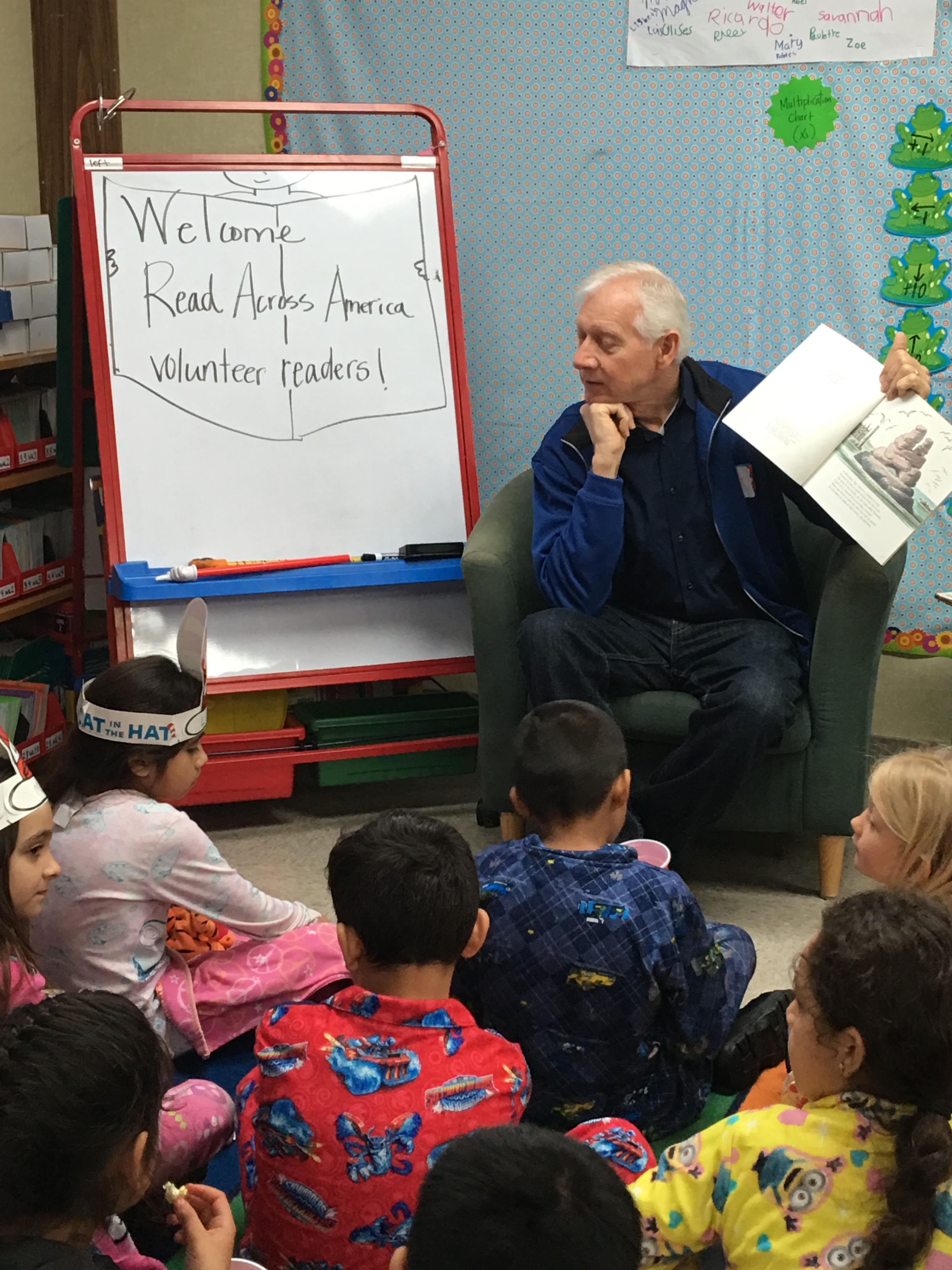 Dennis Krempley, husband of the late Kathy Kremperly, a beloved teacher at Dunbar Elementary School for many years, shares a story with the second grade as the part of the school’s celebration of Read Across America. The day began with a visit from The Cat in the Hat, who congratulated students for being good readers and tracking their reading minutes for a whole month. After the March 4 assembly, students returned to their classrooms for stories read by community volunteers.