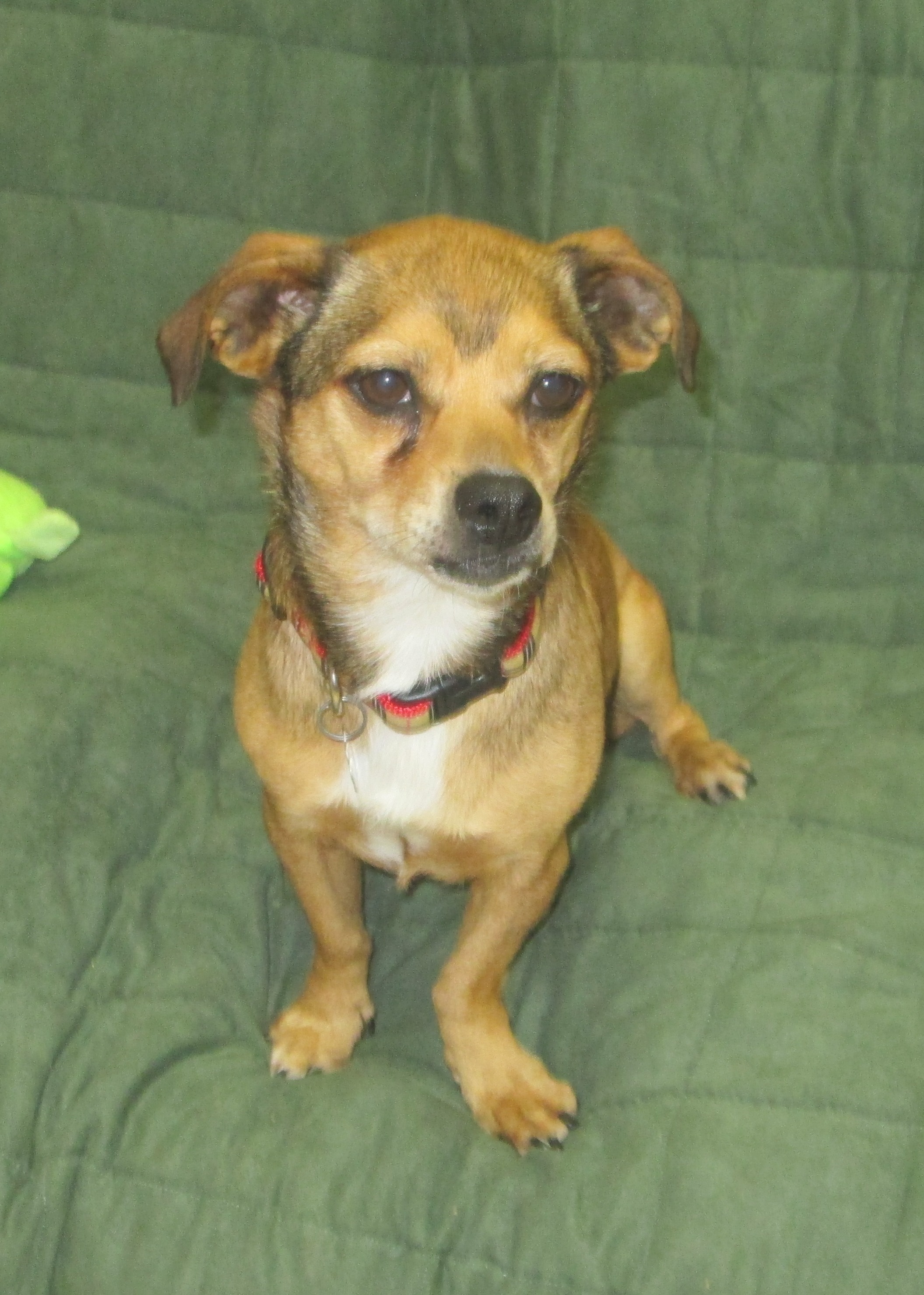 Meet Pasha. Pasha is a 3 year old brown and white male Doxie/Pug mix. He is a wonderful dog and has quickly become a staff favorite. He is very loving and is a great snuggler. He loves to go on walks, play with his toys, or just hang out. Pasha has an easy going personality. He will be a dog you can take everywhere with you, and he will be content as long as he’s with you. Pasha seems to do well with other dogs who share his personality type. A slow introduction to new dogs is the key to making a successful match. If you’re looking to add lots of love to your family, Pasha is your guy!