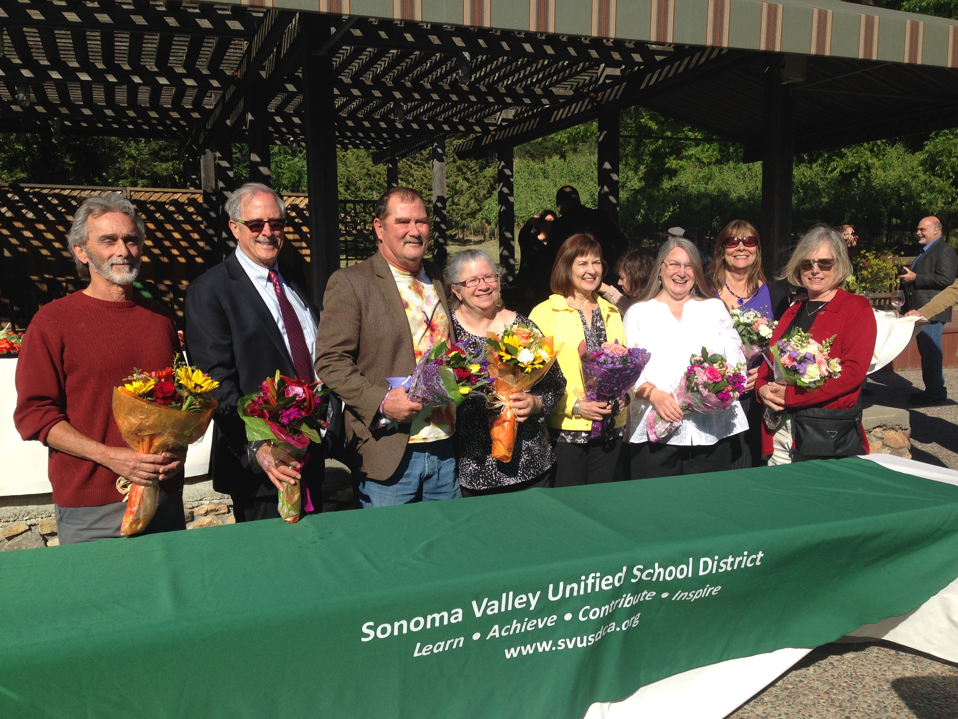 Teachers and staff retiring from the Sonoma Valley School district were celebrated — in story, song and heartfelt thanks from their peers — in a May 20 reception at Gundlach Bundschu Winery: Steve Thomas, David Donnelley, Gary Griffith, Pat Reed, Bonnie Marshall, Kate Tharler, Judy Frey Cohen and Rosemarie Green.