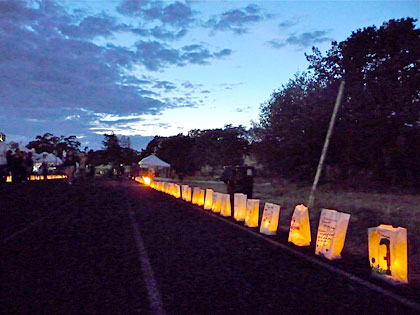 Another emotional, empowering moment is created by the luminaria tributes. At dusk, hundreds of white bags, lit from within by a candle, are placed around the track, each one dedicated in honor of a cancer survivor, or in memory of someone who died from cancer.