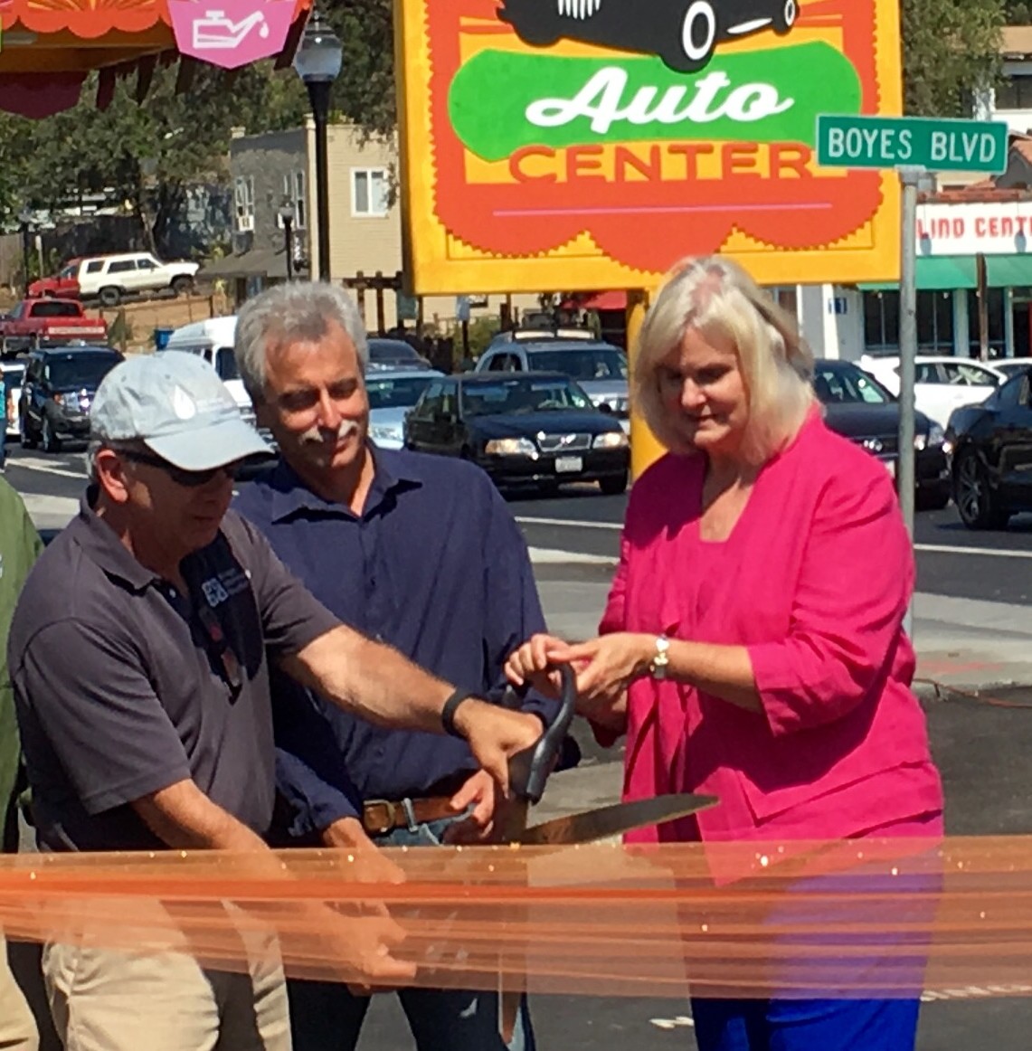 Rich Lee and Supervisor Susan Gorin, backed by Steve Cox, cut the ceremonial ribbon Saturday to officially mark the completion of Phase 2 of the Highway 12 project in the Springs.
