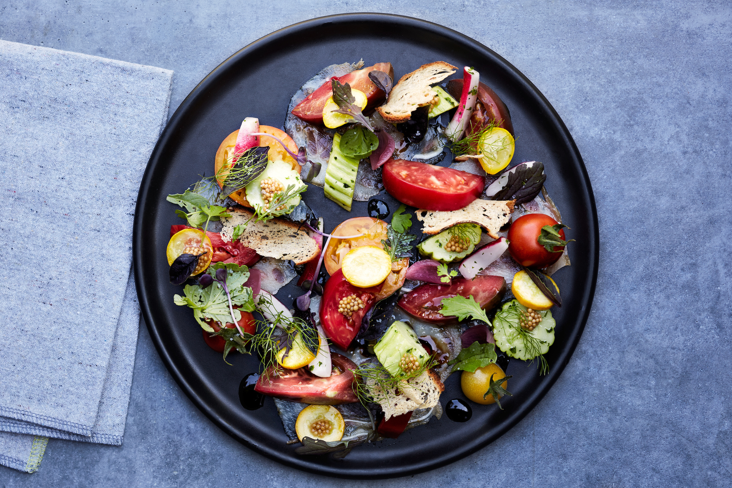 After much debate, we started with the Garden Tomato Salad. The salad was a work of art. Fresh heirloom tomatoes were paired with stunning nectarines from K&J Orchards in Winters.