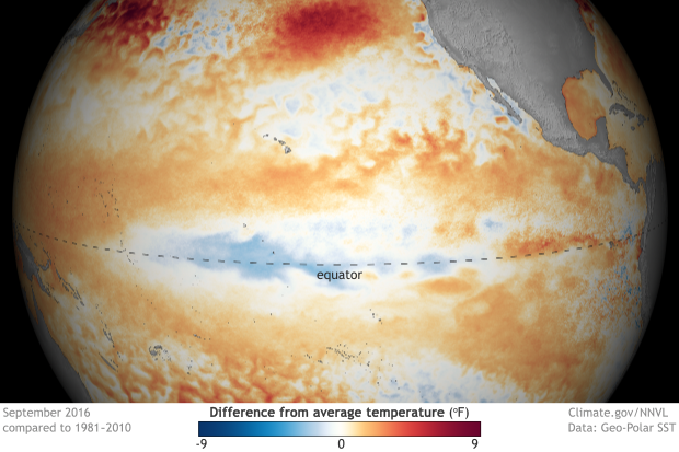 El Niño is characterized by higher than normal temperatures in the Northeastern Pacific Ocean, the effects of which change weather patterns. La Niña, which means The ‘little girl’ in Spanish, is the opposite, the anti-El Niño. Periods of La Niña present below-average sea surface temperatures, what’s termed simply as “a cold event” produced by cold water upwelling from lower in the ocean. These two phenomena represent opposing phases of what’s called ENSO, which is shorthand for El Niño-Southern Oscillation. Particular to the tropical Pacific Ocean, ENSO strongly influences weather patterns globally.