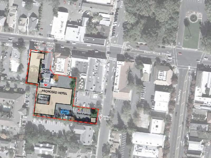 What seemed like a fast track to get the West Napa Street Hotel project approved at a special November 3 Planning Commission meeting has been slowed: the item has been postponed until the panel’s next regular meeting, December 8.The 62-room hotel, restaurant and associated parking is proposed for the 100 block of Sonoma’s West Napa Street, with an entry at 541 First Street West.“The City recognizes that the proposal has generated a lot of interest and that the required environmental studies are lengthy and take time to review,” said Planning Director David Goodison in an email sent today.In order to allow a full opportunity for informed review and comment on the project, Goodison said the applicants have agreed to postpone consideration of the Final EIR, a 1,000-word document, and consideration of the use permit to the Planning Commission meeting of December 8, 2016.Although this is a regular meeting of the Planning Commission, it will be the only item on the agenda.While the short notice on the cancellation of the November 3rd meeting is unfortunate, Goodison said, “we feel it is necessary to allow everyone involved sufficient time to make informed comments and decisions.”