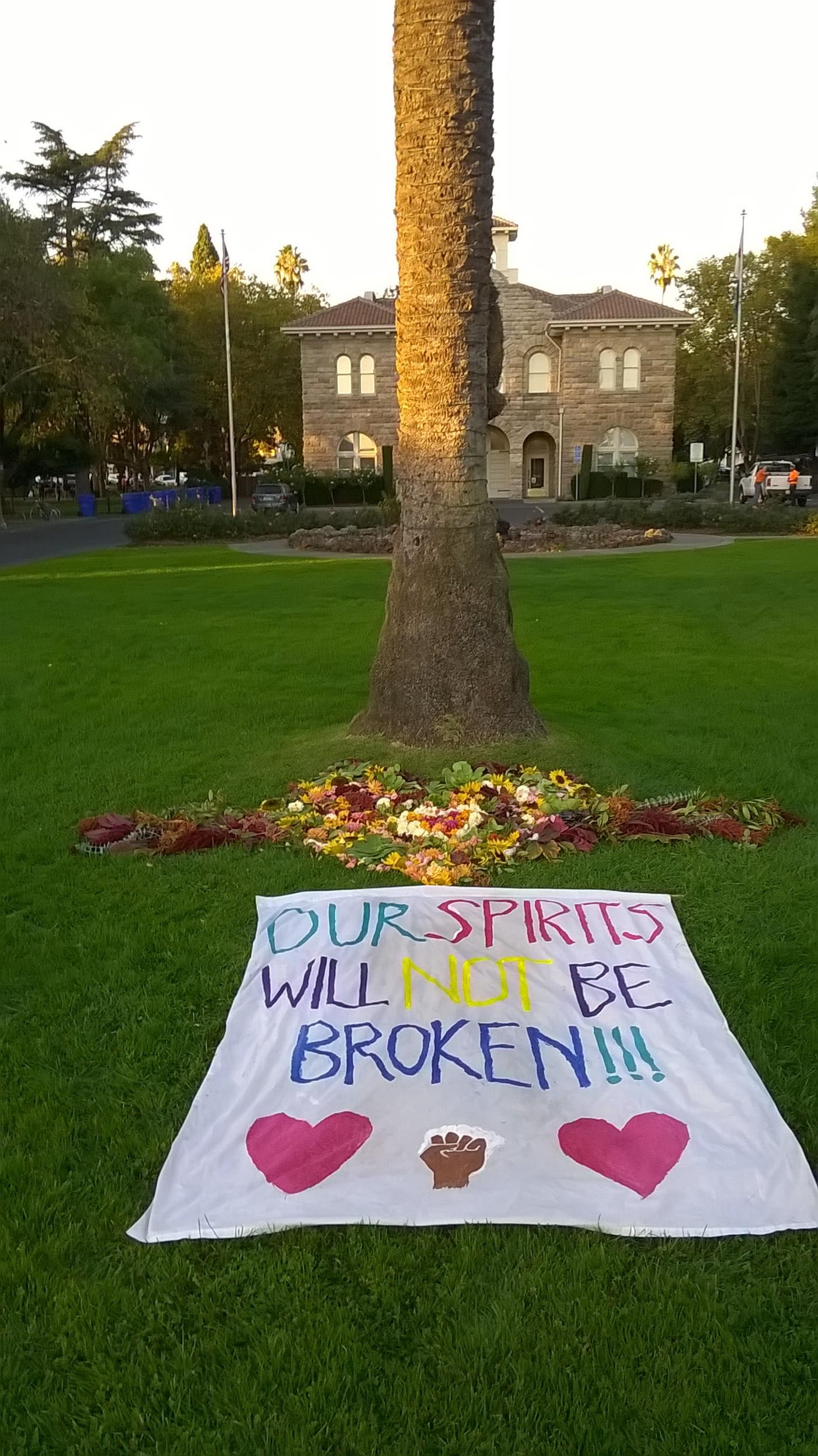 A British tourist stopped to admire the flowers and the banner. “Thank you for doing this,” he said. A Mexican woman with a young daughter said, “I’ve felt a tightening in my throat all day because Trump won. It helps me feel less tense to see this.” A middle-aged woman explained that Trump’s victory felt like a kind of terrorist attack. “I hope that peoples’ spirits aren’t broken,” she said. “We need to go on.”