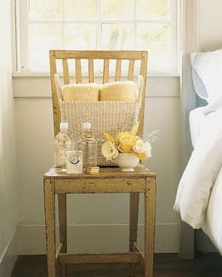 - A mirror. Especially if you don’t have a bathroom attached to said guest room. No one wants to get caught walking out of the room with their hair sticking up in seventeen different directions! Allow your guests the opportunity to comb hair, check make-up and feel confident with their appearance before walking out to greet you. I suggest hanging a framed mirror with a little personality. A gaudy gold frame, carved wood, white-washed shabby chic: anything goes! However, the bigger the better. A large mirror not only helps make the room feel larger, but it doubles as a piece of art. If you have room for a floor mirror, even better!