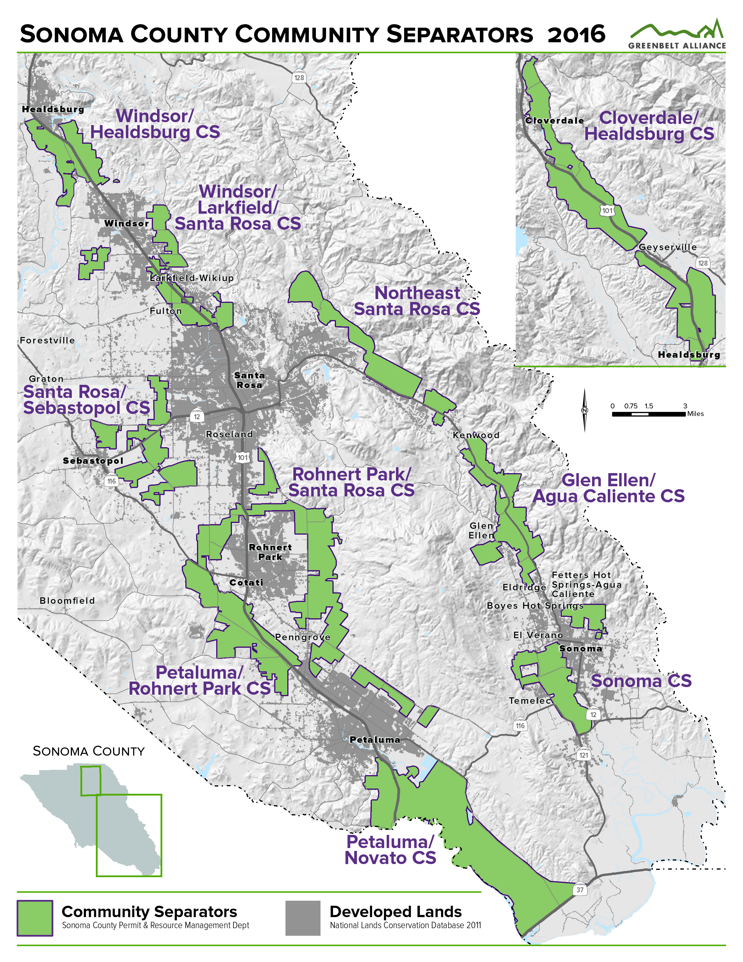 Community separators complement cities’ urban growth boundaries by safeguarding adjacent unincorporated open space and farm lands. “They have enabled Sonoma County to hold back sprawl and prevented us from making the mistakes made in other parts of the Bay Area,” said Shore.