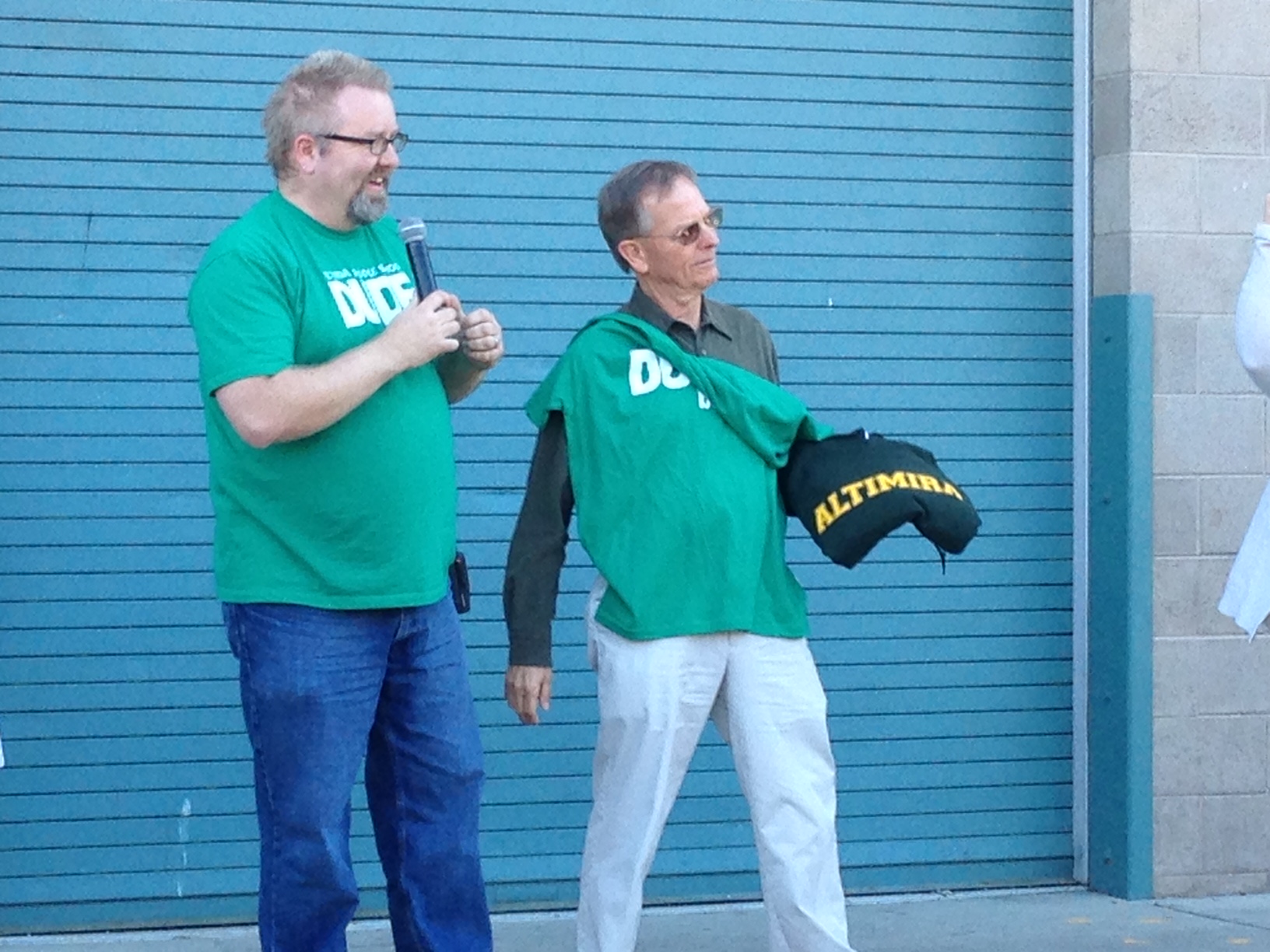Wrapping up ‘Dude, Be Nice’ week at Altimira Middle School, principal William Deeths (left) gives a shout-out — and some Wolf Pack gear — to outgoing School District Trustee Gary DeSmet.
